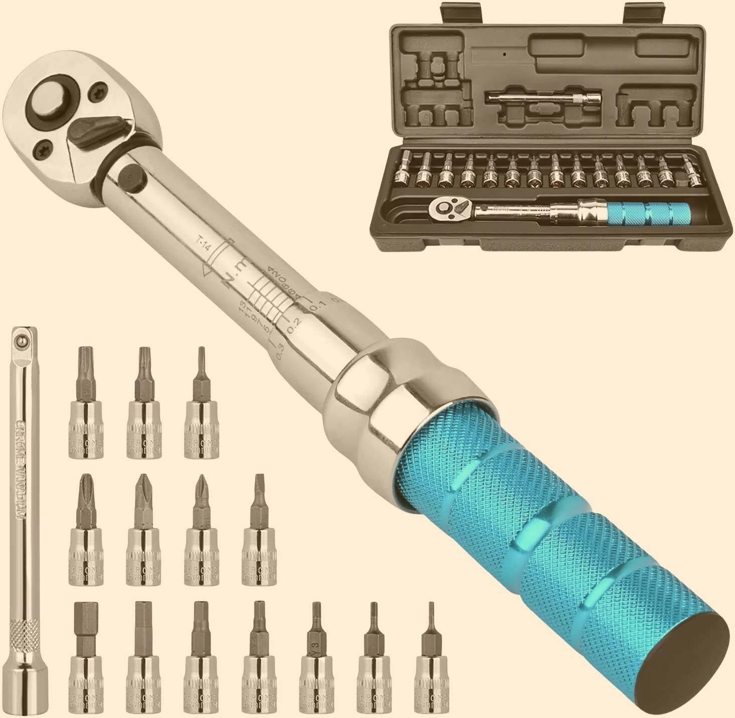 The Vibrelli Bicycle Torque Wrench Set is perfect for road bike and mountain bike enthusiasts looking for a tool that is both sturdy and versatile. The comfortable, anti-slip textured handle and slim design make it easy to use in even the most difficult spaces. The easy-to-read spring-locking micro-adjustment collar makes setting the proper torque simple and the "click" tells you when you've reached the correct torque. Plus, the set comes with an Ironclad Lifetime Manufacturer's Warranty.