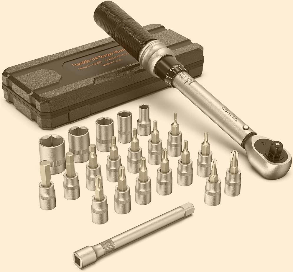 This wrench set includes H2, H2.5, H3, H4, H5, H6, H8 Hex Bits; T10, T15, T20, T25, T27, T30 Torx Bits; PH1, PH2 Philips Bits; 5 Sockets: 6-8-10-12-14mm, 1*1/4" extension bar for reaching concealed bolts. It also comes with a protective molded case for safe storage and a professionally made reversible 45-tooth ratchet head that measures torque in clockwise and counterclockwise directions. Furthermore, its accuracy error is within ±4%, ensuring that every wrench is shipped pre-calibrated to +(clockwise) /- (counter-clockwise) with 4% accuracy. With a torque range of 5.0 to 25.0 Newton Meters and micro adjustment to 0.25 Newton Meters, you can easily install components with calibrated precision. Get your own Handife Bicycle Torque Wrench Set today!
