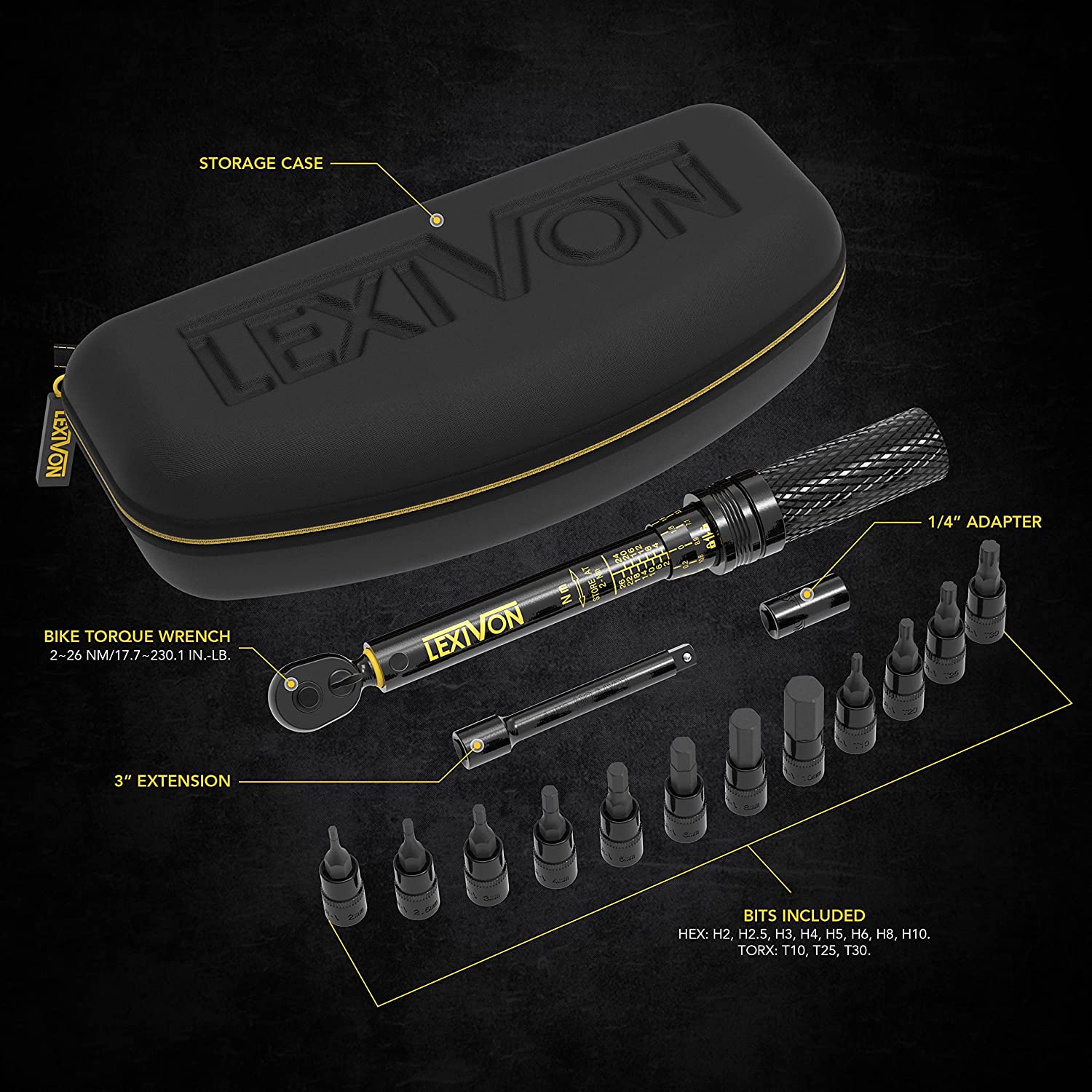 This wrench is calibrated with precise scales of 2-26 Newton Meters (17.7-230.1 in-lb) with micro-adjustments to 0.2 Newton Meters. It also includes bit sockets such as HEX - H2, H2.5, H3, H4, H5, H6, H8, H10, TORX - T10, T20, T25, T30, a 3-inch Extension bar, and 1/4-inch Adapter. It also has a dual-direction ship pre-calibrated and measures torque in both clockwise (+/- 4%) and counter-clockwise (+/- 6%) directions, with a calibration certificate and traceable & unique serial number. This bike wrench is designed to ensure that bolts and nuts are tightened to the proper torque, increasing longevity and preventing damage from over-tightening. Get your own Lexivon Torque Wrench Set today and keep your bike in perfect condition!